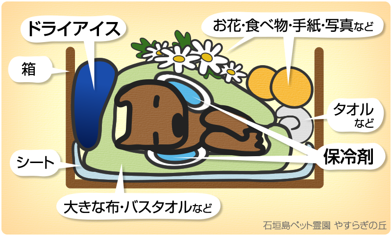 ※ご遺体の包み方は下記「お別れの準備」をご参照ください。ご遺体はダンボール等の中に納め、保冷剤は多めに入れてあげてください。